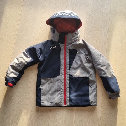Pen Phenix jakke for barn. Brukt som alpinjakke. Foret og vindtett. Str 8-12, men vi anbefaler 8-10. Mange lommer, og snøring i livet. Ingen bruksmerker av betydning.