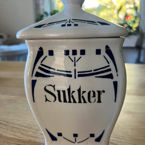 Selger min flotte sukker/kjeks krukke. Vet ingenting om den. Regner med den er Antikk /vintage søkte på Google lens, legger ved hva jeg fikk opp. (Se siste bilde)