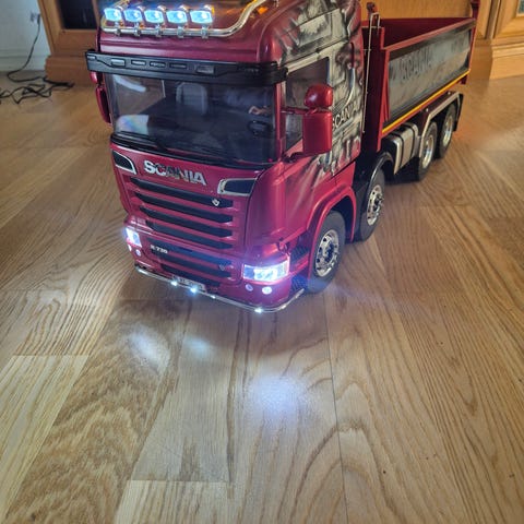 Tamiya Scania tippbil med full servonaut og flysky fjernkontroll. Mangler kunn batteri . +frakt