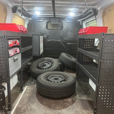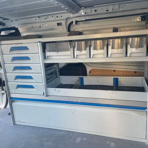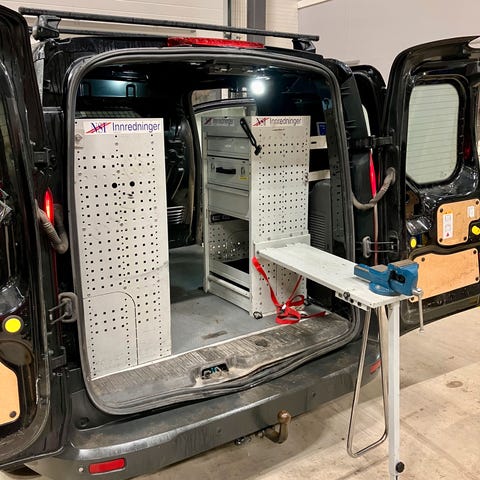 Hel og pen innredning fra NSI Innredning til varebil. Innredningen har skuffer og kofferter til oppbevaring med mulighet for å ta ut av hyllene. Har stått i en Ford Transit Connect.