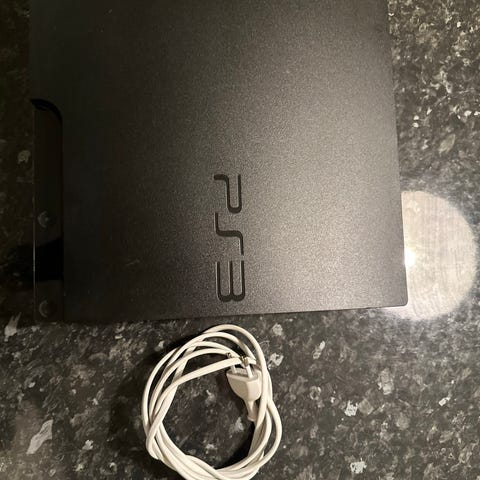 Sony Playstation 3 CECH-2506B spillkonsoll med tilhørende strømledning. Konsollen er svart og har to USB-porter på fronten. Modellen er av typen CECH-2506B.