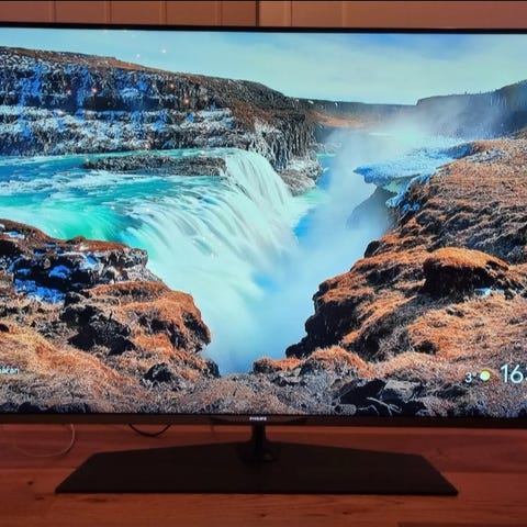 «Tre inn i en modern æra av TV-titting med Philips 43" 4K UHD LED Smart-TV. Den har 3-sidig Ambilight, 4K HDR10+ for topp bildeskarphet med livaktige farger, Dolby Atmos-lyd og innebygd Alexa»