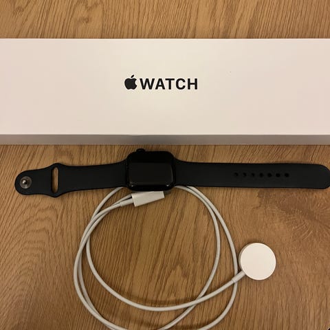 Apple Watch SE ( 2021 eller 2022 husker ikke) 41 sm. smartklokke med svart reim. Inkluderer flere ekstra reimer i forskjellige materialer og farger, samt to ladekabler. Dessverre kan ikke finne esken.