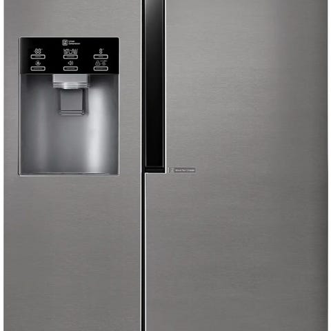 LG Side-by-Side kjøleskap med dobbel dør og vann-/isdispenser på døren. Kjøleskapet har flere hyller og skuffer for oppbevaring av matvarer. Designet i rustfritt stål.