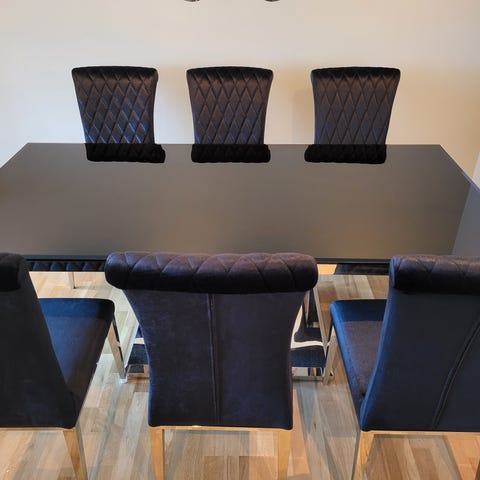 Messina spisebord i sort glass + 8 stoler – som nytt
