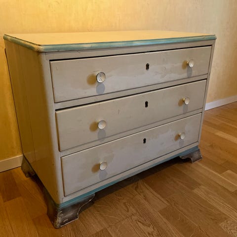 Lekkert, smalt skatoll i brunbeiset treverk. 4 skuffer, og en glasslem som kan trekkes ut og lukke det åpne rommet. Svært pent brukt, allsidig møbel. Må hentes i Tønsberg.