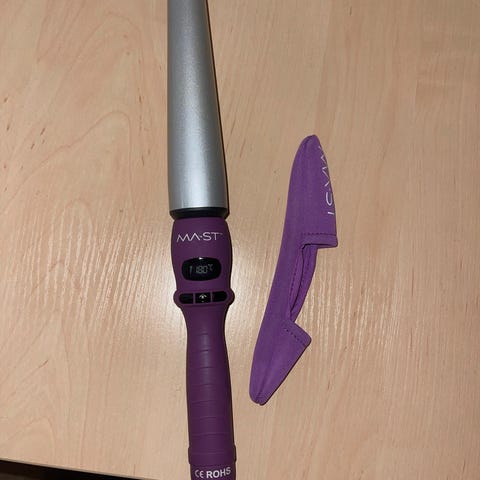 MAST krølltang med digital temperaturvisning, lilla farge og elektrisk tilkobling. Utstyrt med kontrollknapper for temperaturjustering og et vridbart ledningsfeste for enkel bruk.