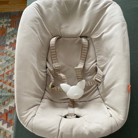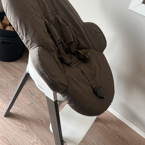Stokke Newborn sete med beige trekk og sikkerhetssele.