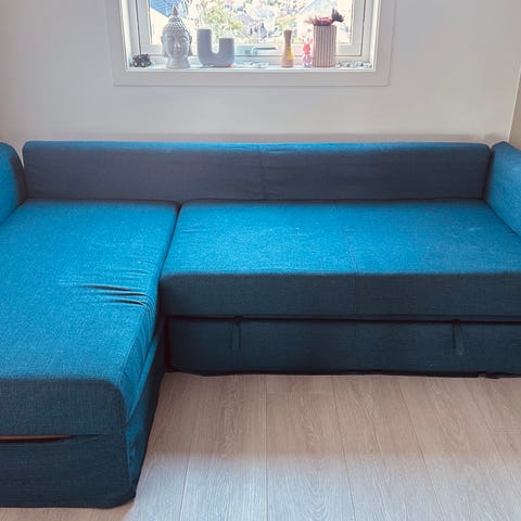 Selger en pent brukt hjørnesofa med sjeselong (høyre side) som enkelt kan gjøres om til en dobbeltseng (150 x 200 cm). Overmadrass kan følge med for ekstra komfort.