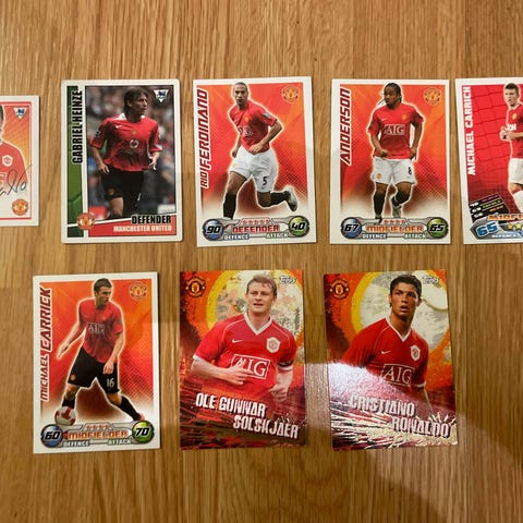 Samling av Manchester United fotballkort med forskjellige spillere i ulike posisjoner. Kortene inkluderer både standard og spesialutgaver med varierende design og signaturer. Passer for samlere og fotballentusiaster.
