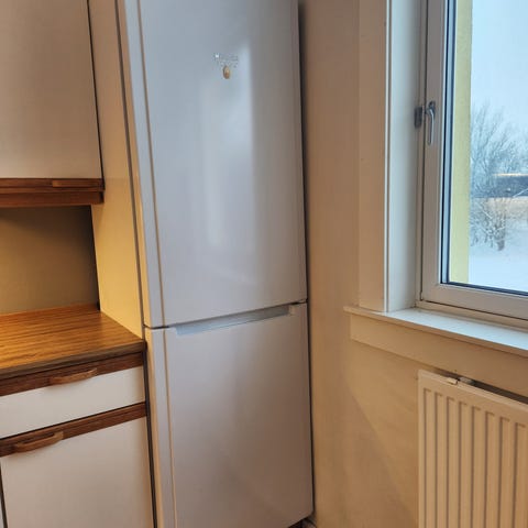 Fungerer som den skal. Sprekk i grønnsaksskuffen på venstre side som kan limes. Noen små merker på front på kjøledelen. Liten bulk på fronten på frysedelen. Matvarer følger ikke med.