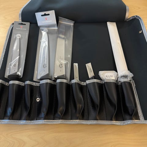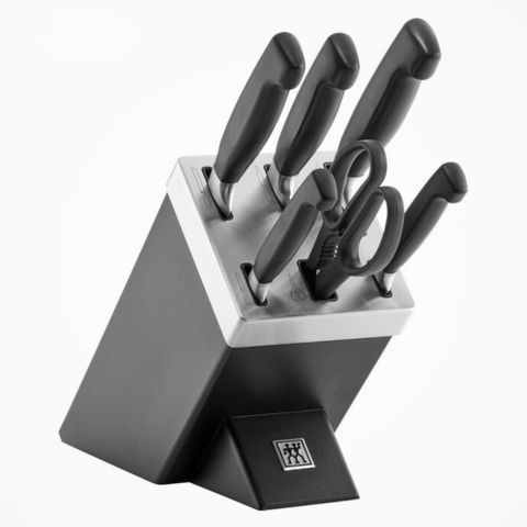 Zwilling Pluton knivsett med 4 deler inkluderer brødkniv, kokkekniv, santokukniv og liten kniv. Knivene har svarte håndtak og blader i rustfritt stål, designet for allsidig bruk på kjøkkenet.