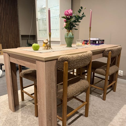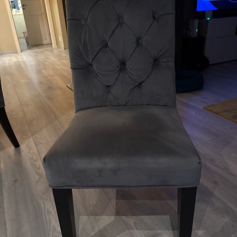 Selger 6 str. av spisestoler fra Jysk. Kjøpte uten tilbud, betalte 5394 kr. Selger alle 6 for 2350kr. Det er litt maling på en av dem, kan ikke se så mye. Stolene er rene uten flekker. Kan hentes i dag
