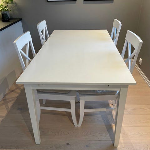 Bord og stoler selges billig - 145 cm langt, kan utvides med ileggsplater - 105 cm bredt
