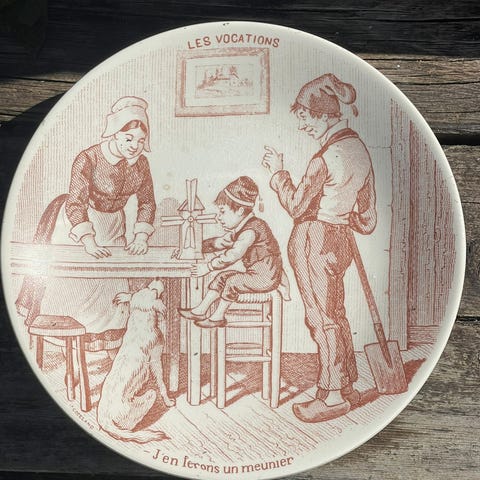 12 stk tre tallerkener (ukjent treslag) i stativ, diameter er 18,5 cm.
