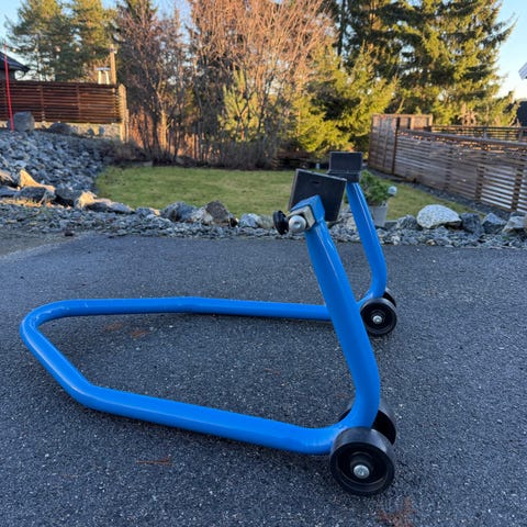 Biltema stativ med hjulholder. Stativet har en høydejusterbar stolpe med to hjulholdere og fire hjul nederst for enkel mobilitet. Materiale og farge er ikke spesifisert.