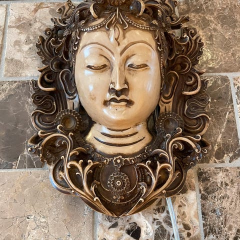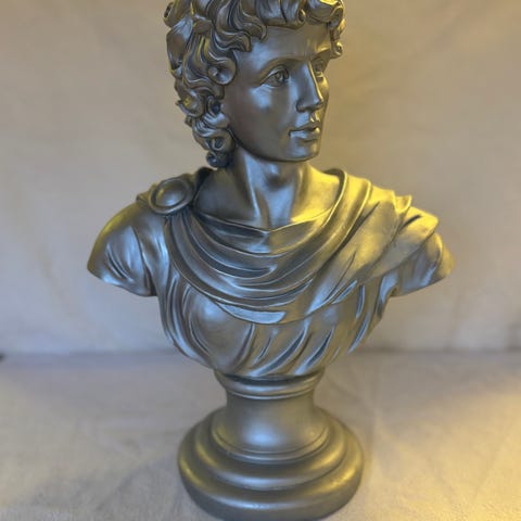 Kunstig stein byste med en høyde på 22 cm. Skulpturen har en detaljert utforming som viser en person med krøllete hår og kledd i kappe. Egnet som dekorasjon i hjem.