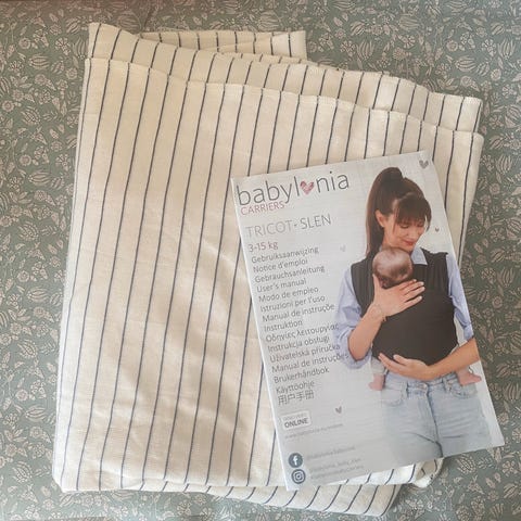 Bæresele med svart stoff og mønster i gult og svart på frontpanelene. Sele med bredt og polstret skulderbånd som krysses i ryggen og knytes rundt midjen. Designet for komfortabel bæring av barn.