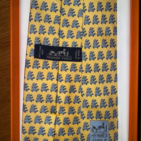 Gult Hermès slips med ender - som nytt. Eske, snøre, konvolutt og pose kan følge med mot tillegg.
