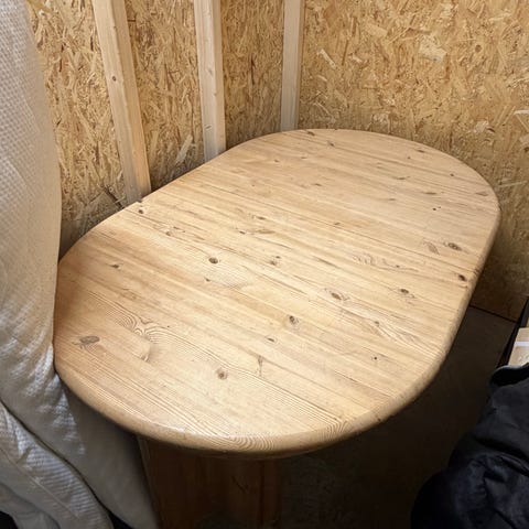 Solid spisebord i tre gis bort. Det er mulighet for å legge i innleggsplater på 50 cm på begge sider, men disse har jeg dessverre ikke.