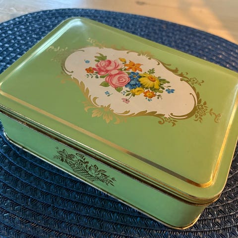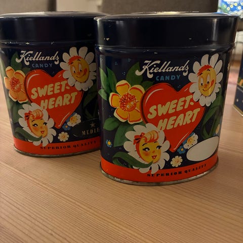 Boksene er gamle, hele og koselige. Med lokk er de 22 cm høye. Det er 3 stk. av dem og de selges samlet, og oppgitt pris er for alle tre.