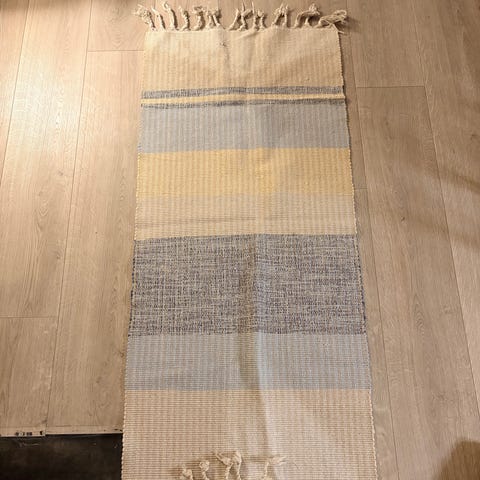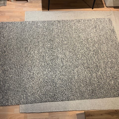 Pent brukt hvitt ullteppe med 87% ull og 13% jute. Godt, varmt, og pent teppe som ikke har plass i vår nye leilighet dessverre! Kan minne om Hay sitt peas teppe