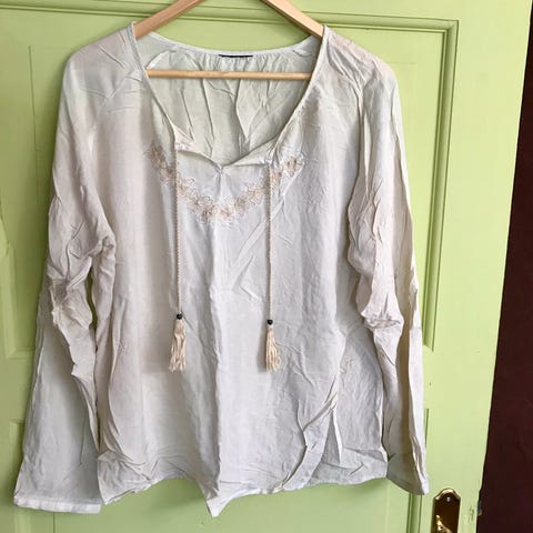3 kvart ermelengde, lett buet i nedkant, asymmetrisk fasong, litt lengre på sidene, se bilder. Ny, ubrukt, vasket.