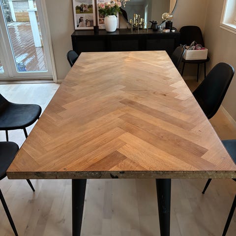 Spisebord gis bort til første som henter. Bordet er i heltre, IKEA Stornäs ifølge klistremerke. Overflaten er slitt og har en god del striper, fungerer fint med duk. Eventuelt kan det pusses opp og oljes på nytt eller males.