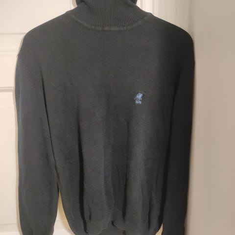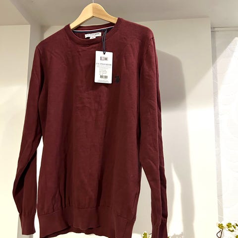 Lite brukt ull lgenser i myk ull fra U.S. Polo Assn. med rund hals i mørke blå farge med en rød logo brodert på brystet. Den er laget for menn og er i størrelse S