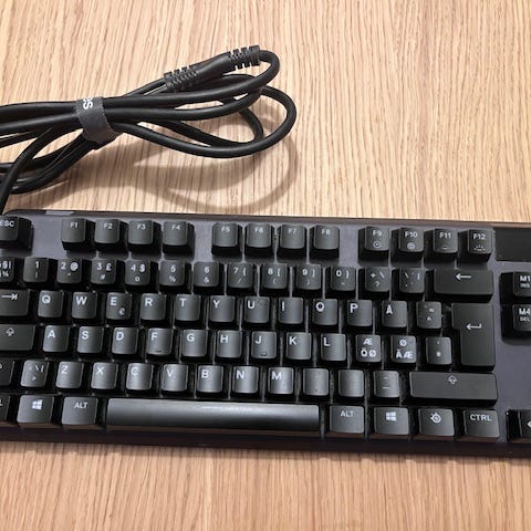 Er skitten mellom tastene men jeg kan vaske det bort hvis det ønskes. Apex 7 TKL med røde switches er et premium gaming-tastatur i kompakt format – perfekt for spillere som vil ha ytelse, solid byggekvalitet og smarte tilpasningsmuligheter, uten at tastaturet tar mye plass. Det gir deg både komfort, respons og fleksibilitet du trenger i konkurransespill eller produktivt arbeid. Mekanisk tastatur for høyt nivå spilling