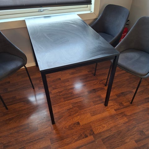 Spisgruppen består av et rundtbord på 75 cm høyt, med diameter på 110 cm med 4 stoler i velour trekk.
