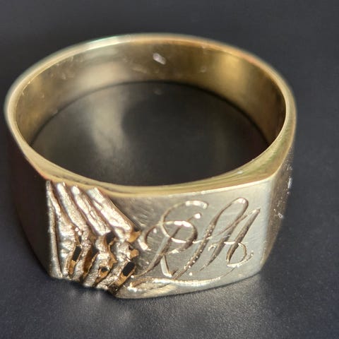 Selges veldig gammel sølvring stemplet 830s med gravering.