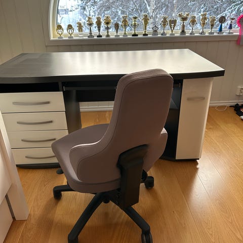 Det er en pult fra IKEA som er brukt i kanskje 2 måneder. Den har fem hyller. Den har dessverre noen små merker under pulten etter teip-rester.