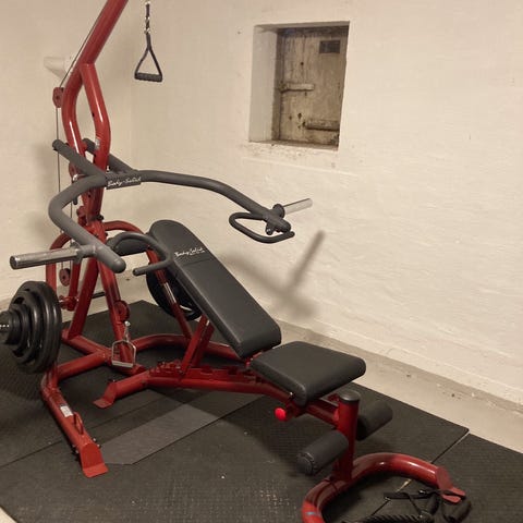 Solid treningsapparat til hjemmebruk/ evt treningsstudio. . Strikker følger med og man kan skaffe ekstra utstyr. Nyere modell koster nå ca 19000 , dette er en tidlig versjon. Solid, og varig! Brukes til mange øvelser , tåler kroppstyngde ved rygghev, ettbens løft, markløft etc. Fin å kombinere med vektstang, løse vekter eller strikker med ulik belastning.