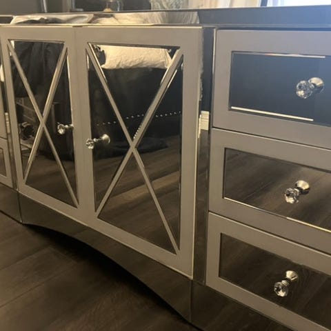 Speil 120 x 80 kan følge med om ønskelig. Det har dimbart lys og dimmmebryter kan følge med. Speilet har en skade i kanten nederst i venstre hjørne, men som ma kan se av bildene kan dette enkelt skjules slik forrige eier gjorde for eksempel.