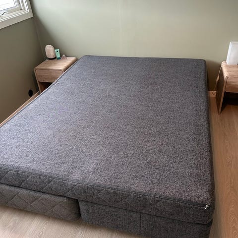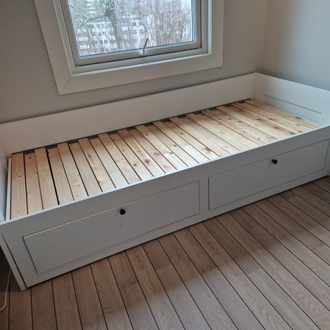 Sengen har stått i en hybel og fremstår uten skader/merker. Madrasser og overmadrass følger ikke med.