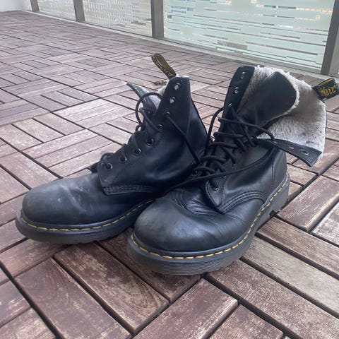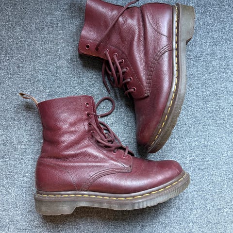 Selger et par dr. Martens snørestøvler i mørjebrunt skinn. Noe slitasje i helkappe på venstre sko, ellers mest sålene som er slitt.