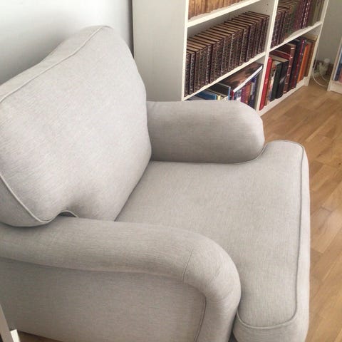 Jeg kjøpte nylig denne lenestolen brukt, men den ble dessverre litt for stor for stua mi. Stolen er svært myk og komfortabel å sitte i, og fremstår som pent brukt.