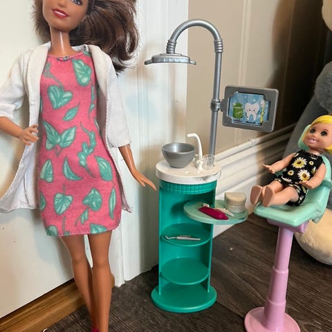 Selger ubrukt «barbie» av merket Simba, med tannlegestol, barnepasient og utstyr. Aldri lekt med, bare tatt ut av esken. Har ikke esken.