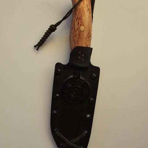 Øksen er hånd smidd med 1095 og 15N20 høy og lav carbon stål, smidd med over 200 lag stål, og bladet er 58 HR (hardhet)
