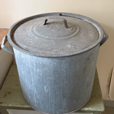 Dette er et originalt bruksobjekt med autentisk patina, tydelige bruksspor fra kull og varme, og klassisk håndbanket utførelse. Ikke pusset eller restaurert – patina er bevart.
