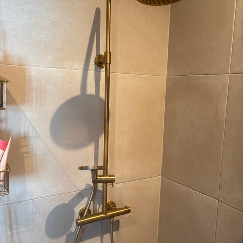 Komplett sett med toppdusj og hånddusj. Alt fungerer som det skal, uten lekkasjer eller skader. Dusjsettet gir et moderne, rent uttrykk og passer perfekt i små og store bad.