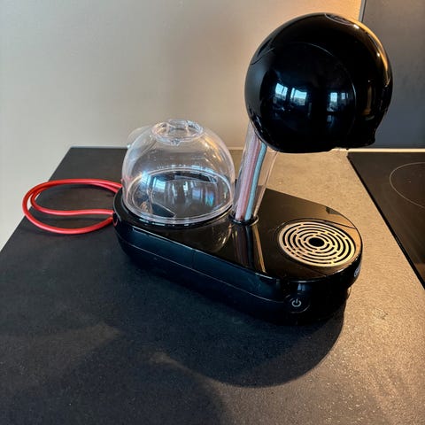 Dolce Gusto kaffemaskin for kapsler, modell «Drop». Noen år gammel, men fungerer som den skal. Bøtte til brukte kapsler, samt ekstra rensemiddel, følger med.
