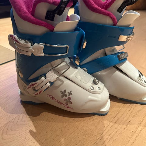 Head alpinstøvler størrelse 230mm for barn. I fargene hvit og svart med flere spenner for justering. Støvlene er pent brukt.