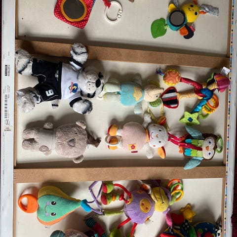 Bade «klosser», biteleke fra Konges sløyd, svømmende badeleke og bilnøkler med lyd.