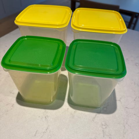 9 gjennomsiktige plastbeholdere. Beholderne er firkantede og egnet for oppbevaring av mat eller andre små gjenstander. Materialet er plast.
