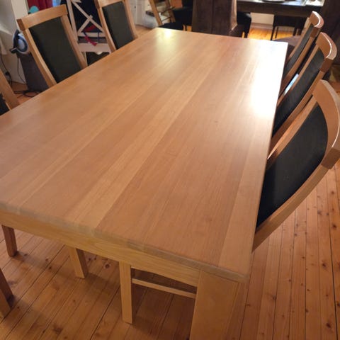 Massivt solid spisebord med 7 stoler og ekstra ikeggsplate.