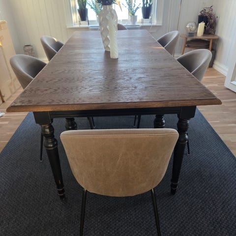 Stort og solid spisebord fra IKEA. Med to klaffer som ligger skjult i bordet, veldig praktisk og lett tilgjengelig.