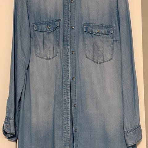 Denim skjorte/overskjorte i mørk blå. Litt kort og vid modell som også er fin uten å lukkes. Fargen er vanskelig å få korrekt, så ett bilde er lånt fra nettet for å vise best mulig.