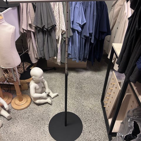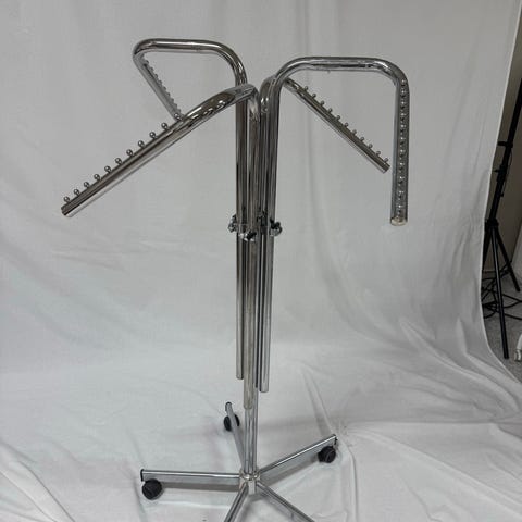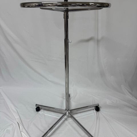 Solid klesstativ med 4 regulerbare armer. Står på hjul og kan flyttes. Armene reguleres i høyden. 3 av 4 skruer er byttet, se bilde. Diameter fot ca 60-70 cm. Høyden tilpasses. Sendes ikke.